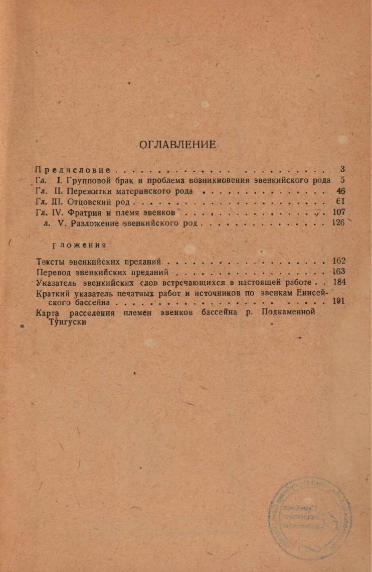 Родовое общество эвенков.- Л. : Изд-во Ин-та народов Севера ЦИК СССР им. П. Г. Смидовича, тип. "Коминтерн", 1936. - Обл., 195 с., 1 вкл. л. карт.