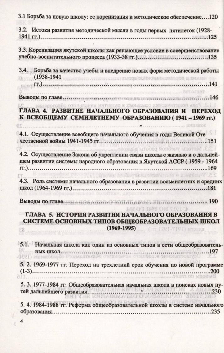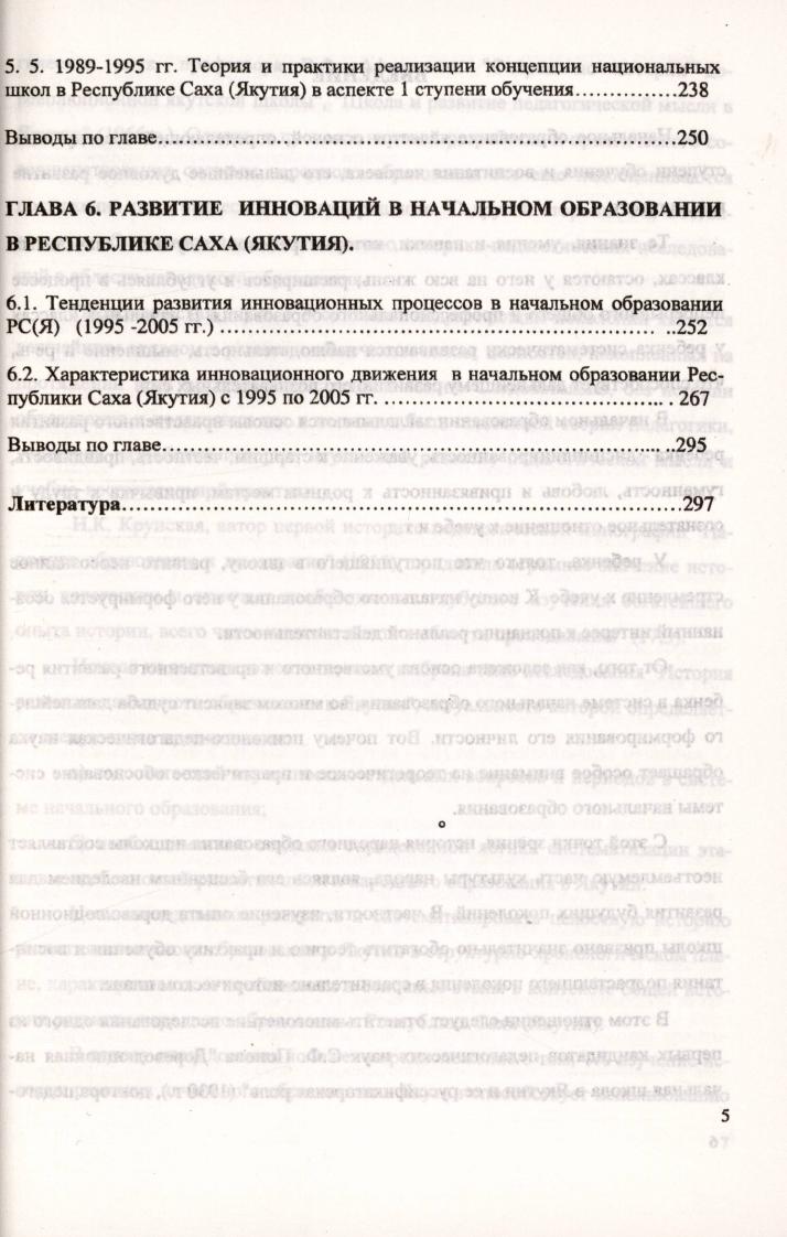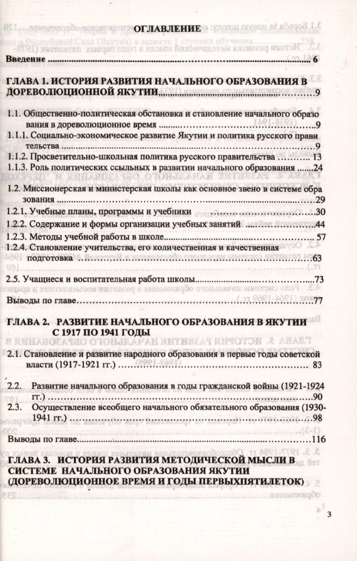 В монографии рассматриваются основные этапы развития начального образования в Якутии с дореволюционных времен до современности в контексте той или иной образовательной политики, директивных документов и инновационных педагогических идей. Особое внимание уделено хронологической последовательности изложения материалов исследования, историзму подхода к разработке темы, социокультурному анализу. Создается общая картина процесса становления и развития системы начального образования в республике с учетом особенностей природно-климатического, социально-экономического, культурно-бытового, национально-регионального развития Республики Саха (Якутия)