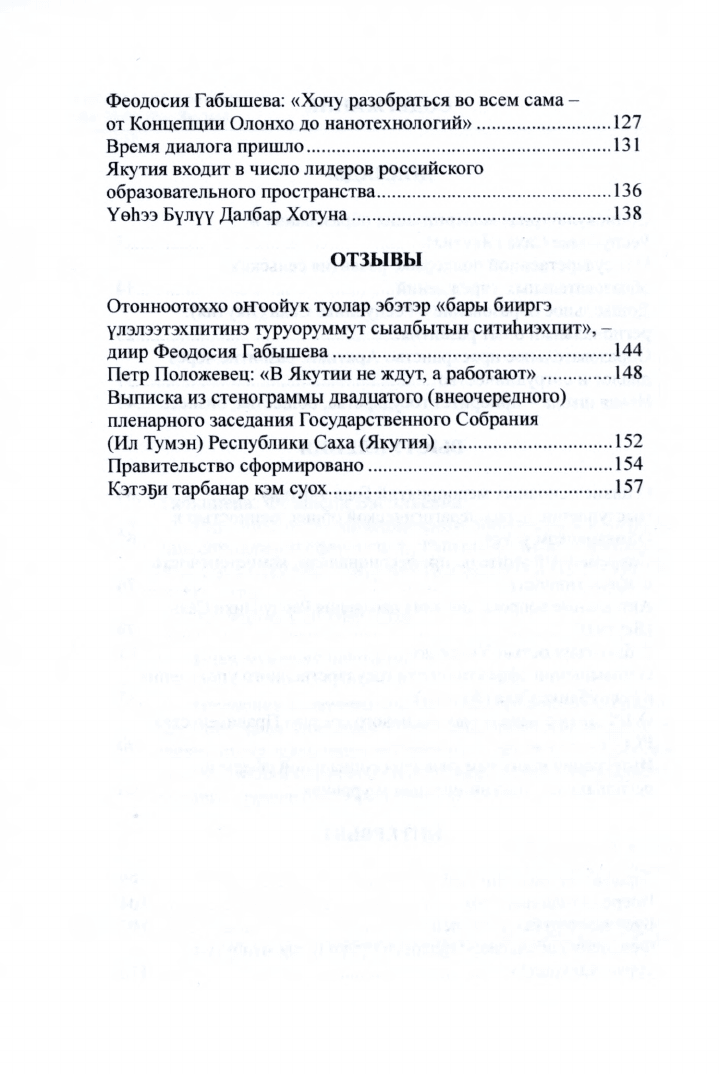 В сборник включены доклады, выступления, интервью и другие материалы, связанные с деятельностью Габышевой Ф. В., заместителя председателя Правительства РС(Я)