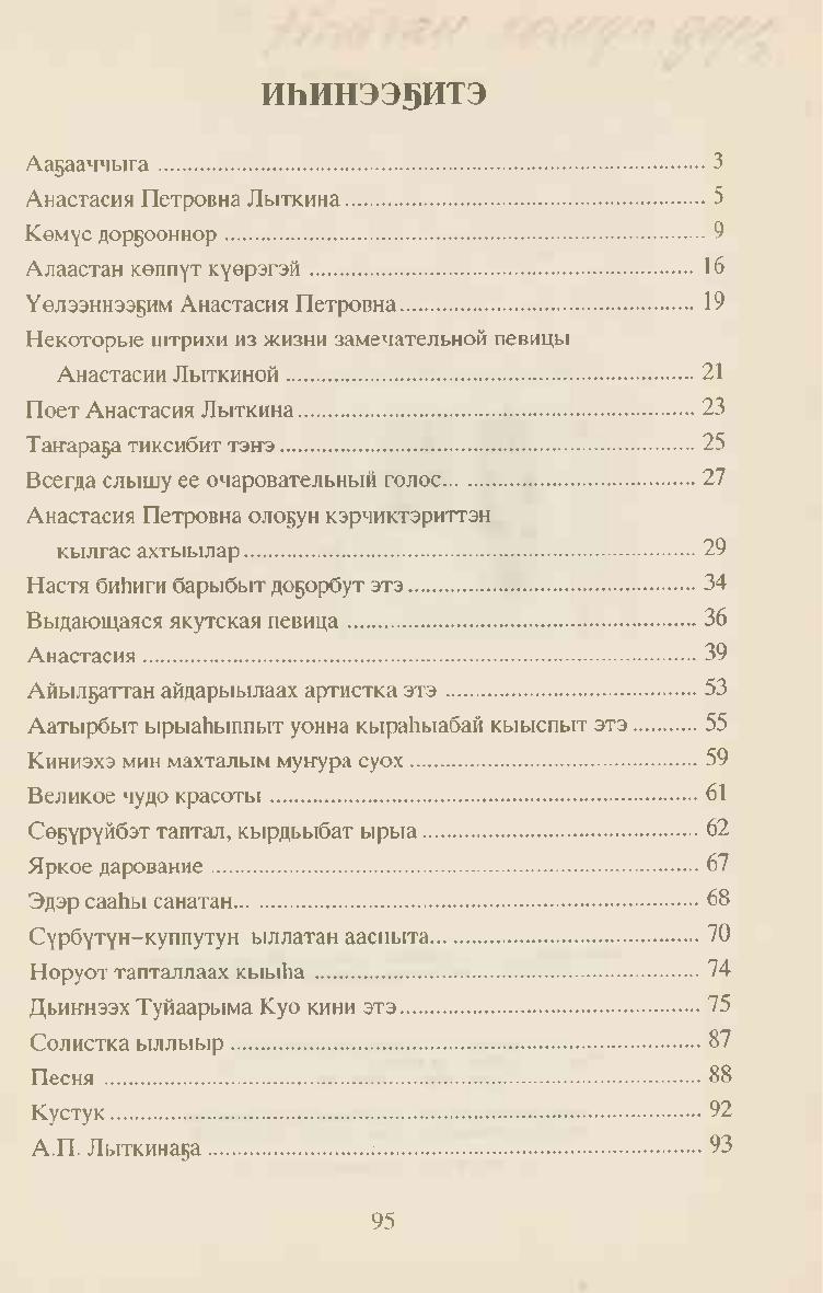Кэрэҕэр сүгүрүйэ, долгуйа... : РСФСР уонна Саха АССР үтүөлээх артистката Анастасия Лыткина туһунан ахтыылар / хомуйан оҥордо, редакциялаата А. С. Соловьева. - Дьокуускай : Сахаполиграфиздат, 1998. - 95 с.