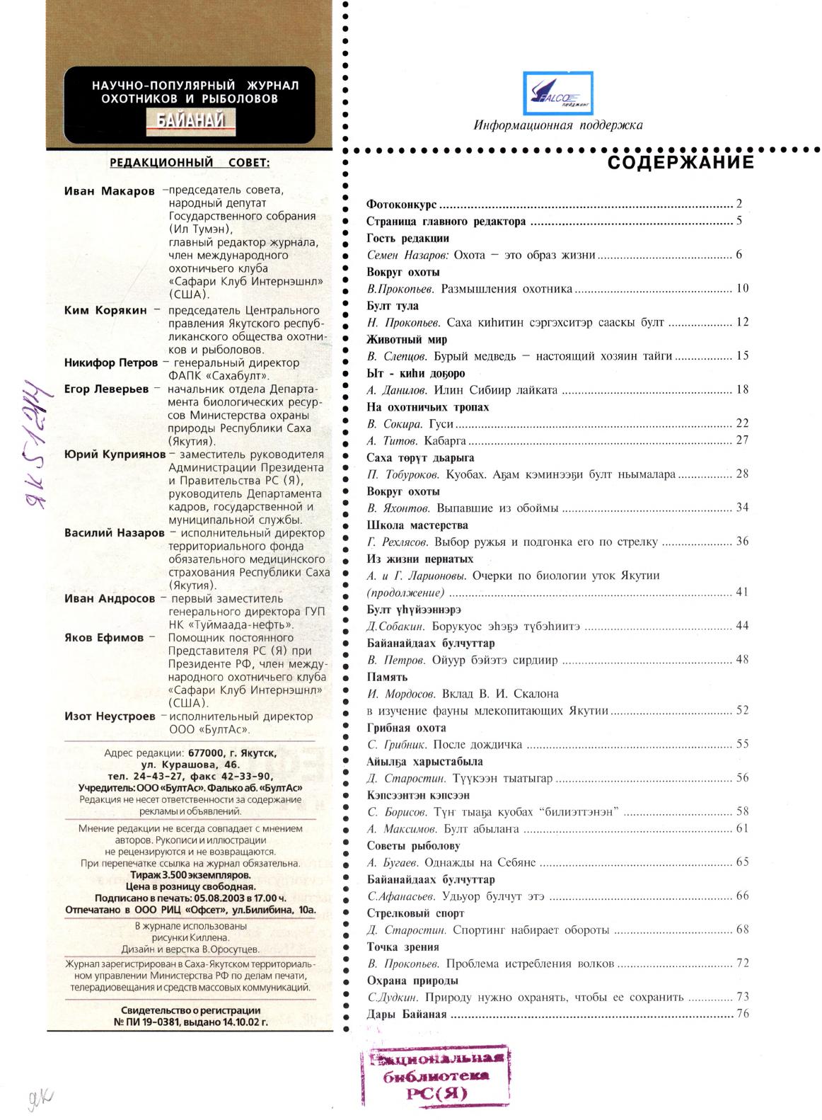 - 2. Байанай: научно-популярный журнал охотников и рыболовов. булчуттар уонна балыксыттар сурунааллара, 2003, №2 (5)
