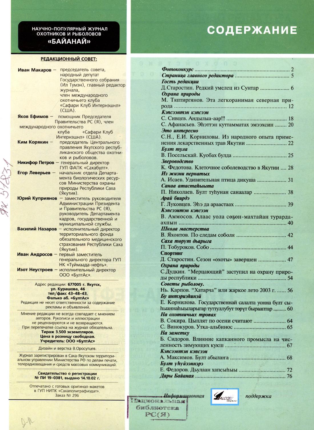 - 3. Байанай: научно-популярный журнал охотников и рыболовов. булчуттар уонна балыксыттар сурунааллара, 2003, №3 (6)