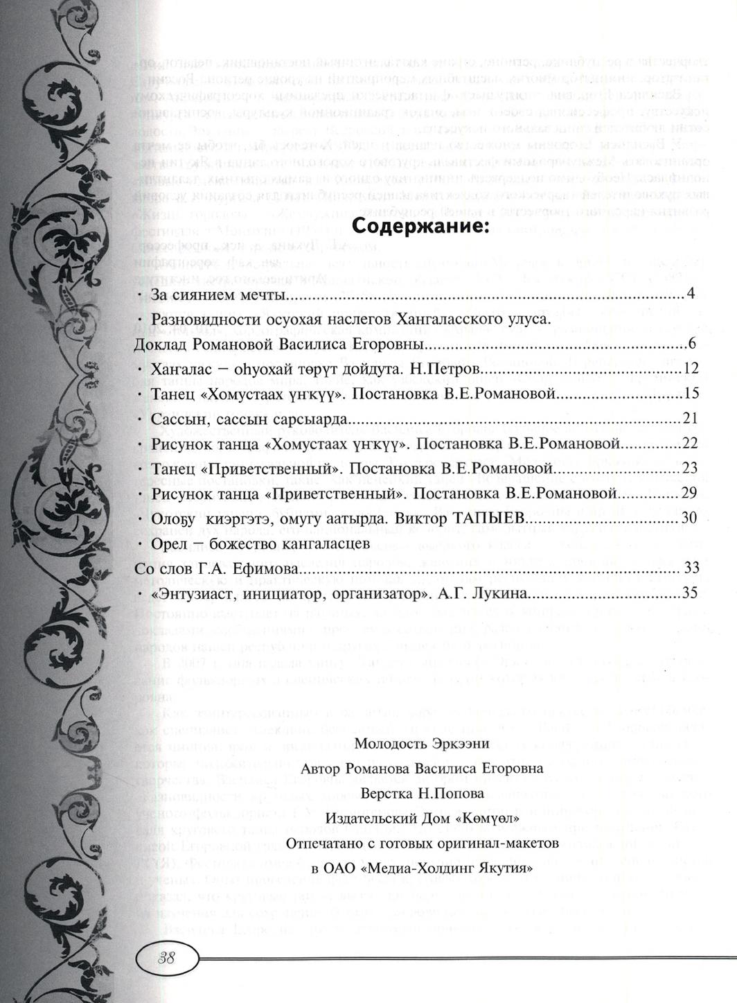 Брошюра написана по итогам первого фестиваля круговых танцев Сибири, который проводился в священной Хангаласской земле в местности Орто Дойду в 2009 году. Брошюра предназначена для широкого круга читателей и молодых руководителей различных танцевальных объединений