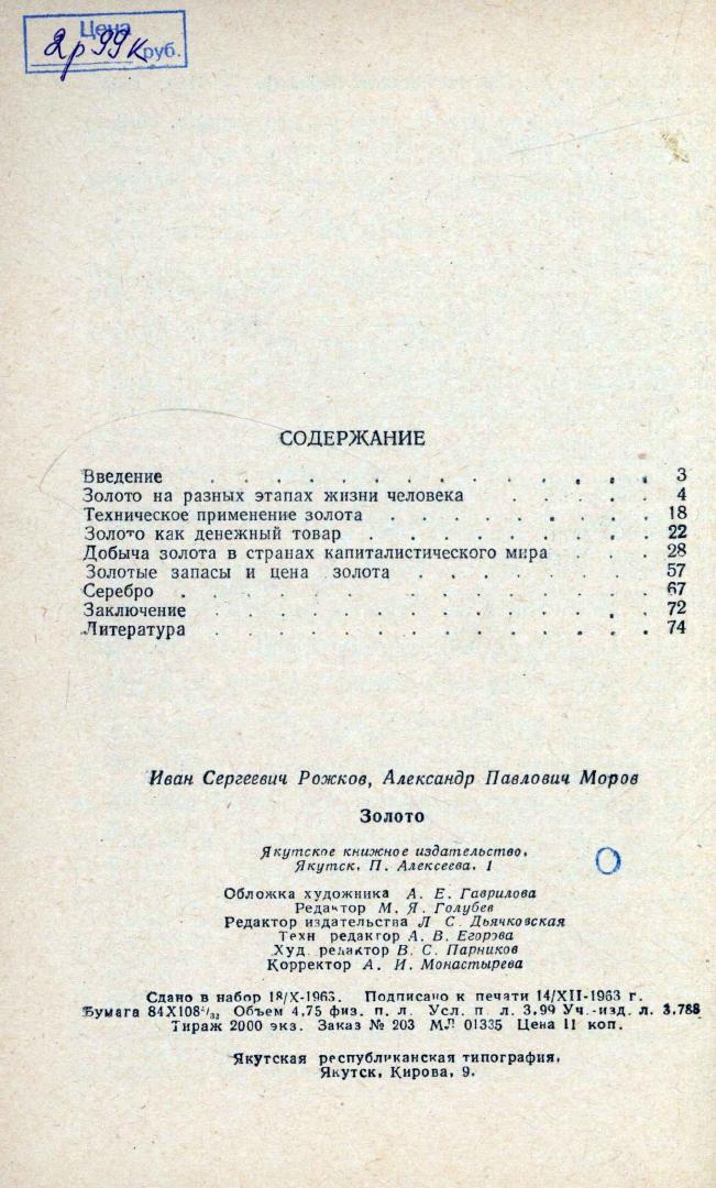 Золото : историко-экономический очерк / И. С. Рожков, А. П. Мороз ; Общество по распространению политических и научных знаний РСФСР, Якутское отделение. - Якутск : Якуткнигоиздат, 1963. - 73, [3] с.
