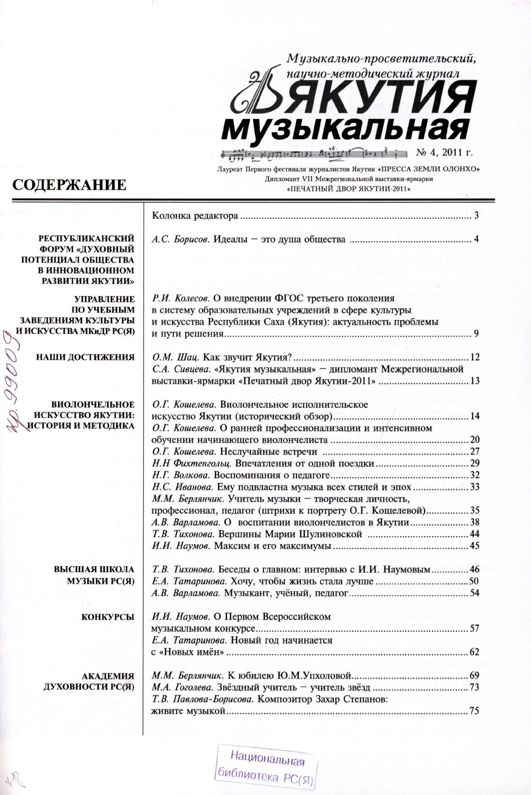 Якутия музыкальная : научно-методический, музыкально-просветительский журнал / Упр. по учеб. заведениям культуры и искусств МКиДР РС (Я), Высш. шк. музыки (ин-т) РС (Я). - Якутск : [б. и.], 2009-.