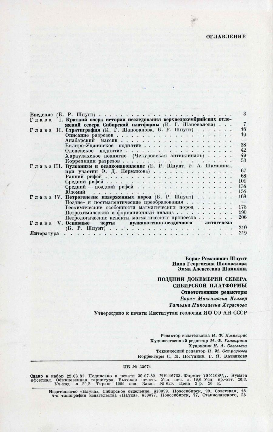 Поздний докембрий севера Сибирской платформы / Б.Р. Шпунт, И.Г. Шаповалова, Э.А. Шамшина ; Отв. ред. Б.М. Келлер, Т.Н. Херсакова. - Новосибирск : Наука, 1982. - 226 с.