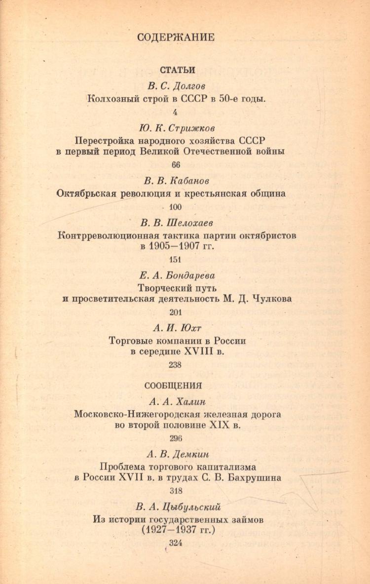 В томе рассматриваются меры партии и правительства по подъему производительных сил и общественного производства колхозов в 50-е годы, исследуются проблемы истории народного хозяйства в первый период Великой Отечественной войны, анализируются коренные изменения крестьянской общины под воздействием социалистической революции. Ряд статей посвящен истории революции 1905—1907 гг., торговым связям России с Востоком, русского просвещения в XVIII в.