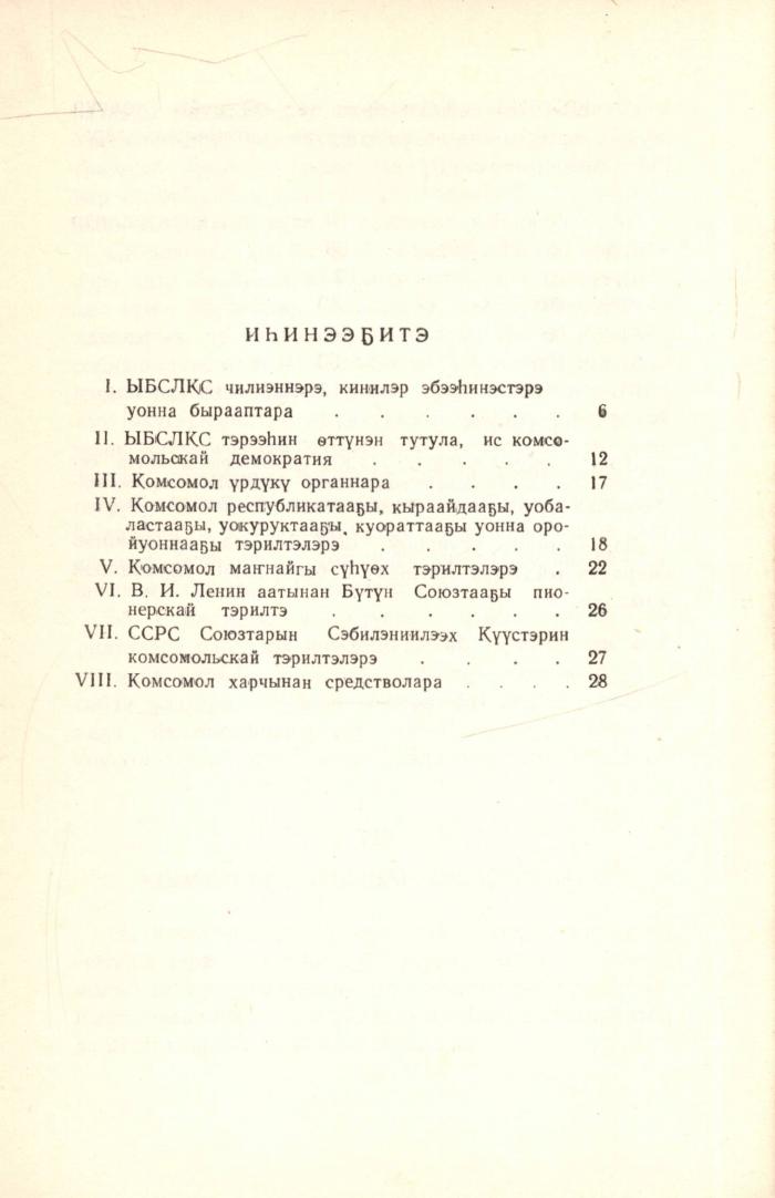 Ыччат Бүтүн Союзтааҕы Ленинскэй Коммунистическай Союһун устааба : ЫБСЛКC XIV съеһинэн 1962 с. муус устар 19 күнүгэр ылыллыбыта. - Якутскай : Саха сиринээҕи кинигэ издательствота, 1962. - 28, [2] с.