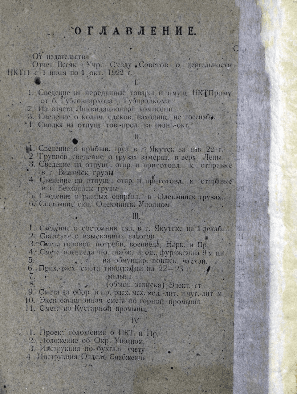 Народный комиссариат торговли и промышленности. Материалы к отчетам НКПТ на Всеякутском Учредительном Съезде Советов 1922 г. ЯАССР : [сборник материалов к отчетному и по производительному плану докладам НКТП]. - Якутск : Издание Организационного отдела НКТП, 1922. - 65 с., [1] л. схем.
