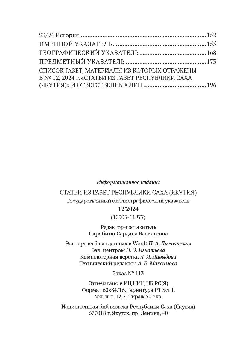 Статьи из газет Республики Саха (Якутия) : государственный библиографический указатель = Саха Өрөспүүбүлүкэтин хаһыаттарыгар киирбит ыстатыйалар : судаарыстыбаннай библиографическай ыйынньык / Министерство культуры и духовного развития Республики Саха (Якутия), Национальная библиотека Республики Саха (Якутия), Центр обеспечения информационными ресурсами. - Электрон. дан. - Якутск : ИЦ НБ РС(Я), 2018- . 2024, N 12 (10905-11977). - 2024. - 1 файл (199, [1] с.