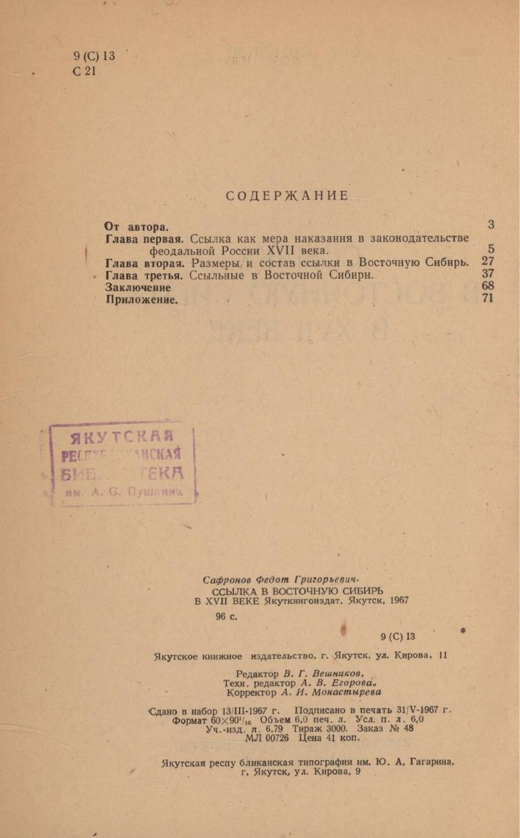 Ссылка в Восточную Сибирь в XVII веке / Ф. Г. Сафронов. - Якутск : Якуткое книжное изд-во, 1967. - 95, [1] с.