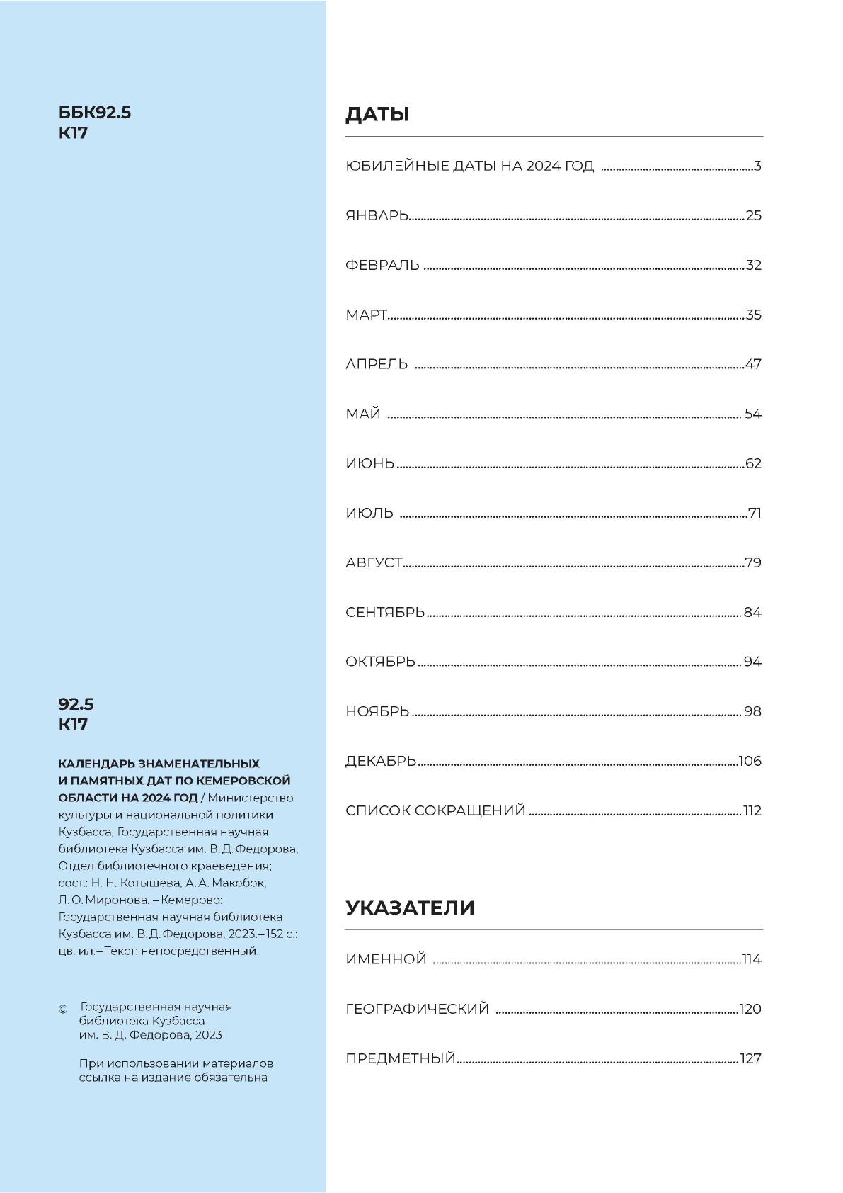...на 2024 год / Министерство культуры и национальной политики Кузбасса, Государственная научная библиотека Кузбасса им. В. Д. Федорова, Отдел библиотечного краеведения ; главный редактор: Миронова Л. О. ; составители: Котышева Н. Н. [и др.]. - Кемерово : Государственная научная библиотека Кузбасса им. В. Д. Федорова, 2023. - 152 с.