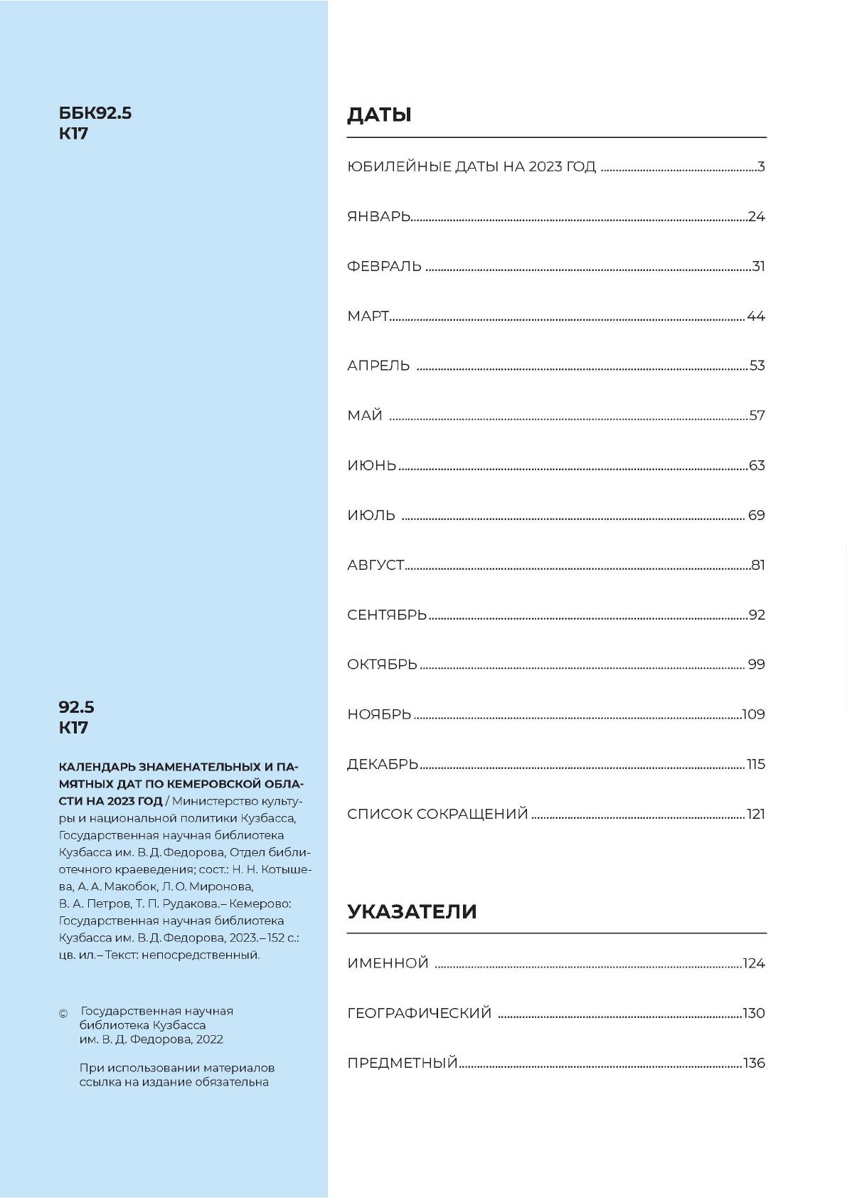 Очередное издание Календаря знаменательных и памятных дат по Кемеровской области познакомит вас с важными событиями 2023 года из политической, хозяйственной и культурной жизни региона. Источниками информации для календаря послужили книги, журналы и газеты, которые хранятся в фондах библиотек Кузбасса, а также сведения из Государственного архива Кемеровской области, Единого государственного реестра юридических лиц Российской Федерации, баз данных Территориального органа Федеральной службы государственной статистики по Кемеровской области и иных авторитетных источников. В этот календарь вошли только знаменательные и памятные даты кратные десяти и пяти. На некоторые события составлены фактографические и библиографические справки. Отдельное внимание заслуживает рубрика "Это интересно". Издание оснащено вспомогательным поисковым аппаратом - именным, предметным и географическим указателями