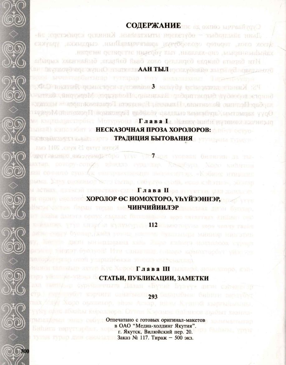 Данное научное исследование является первой в якутской фольклористике работой, посвященной исследованию несказочной прозы хоролоров. В книге проведена систематизация несказочной прозы в исторические, топонимические, тотемические и т.д.