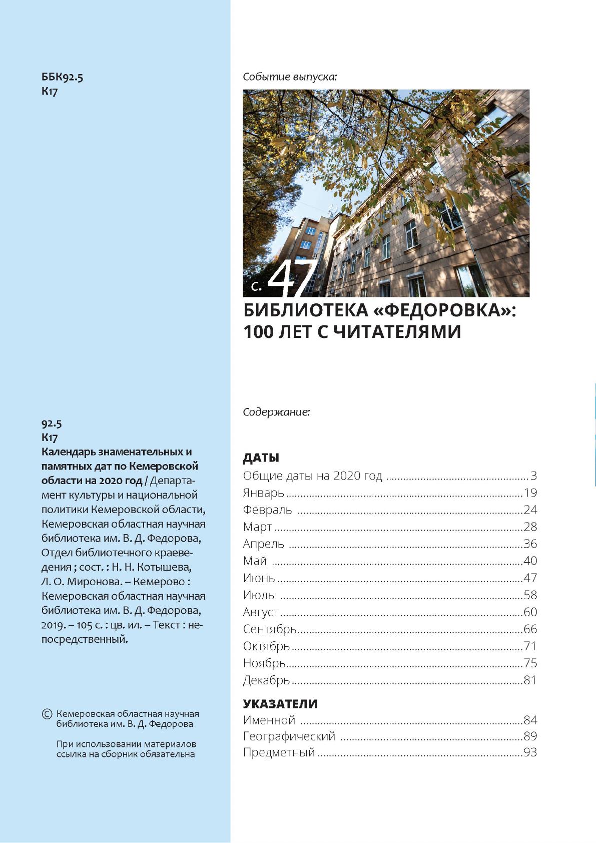 Календарь знаменательных и памятных дат по Кемеровской области... / Министерство культуры и национальной политики Кузбасса, Государственная научная библиотека Кузбасса им. В. Д. Федорова, Отдел библиотечного краеведения. - Кемерово : ГНБК им. В. Д. Федорова, 2004- .