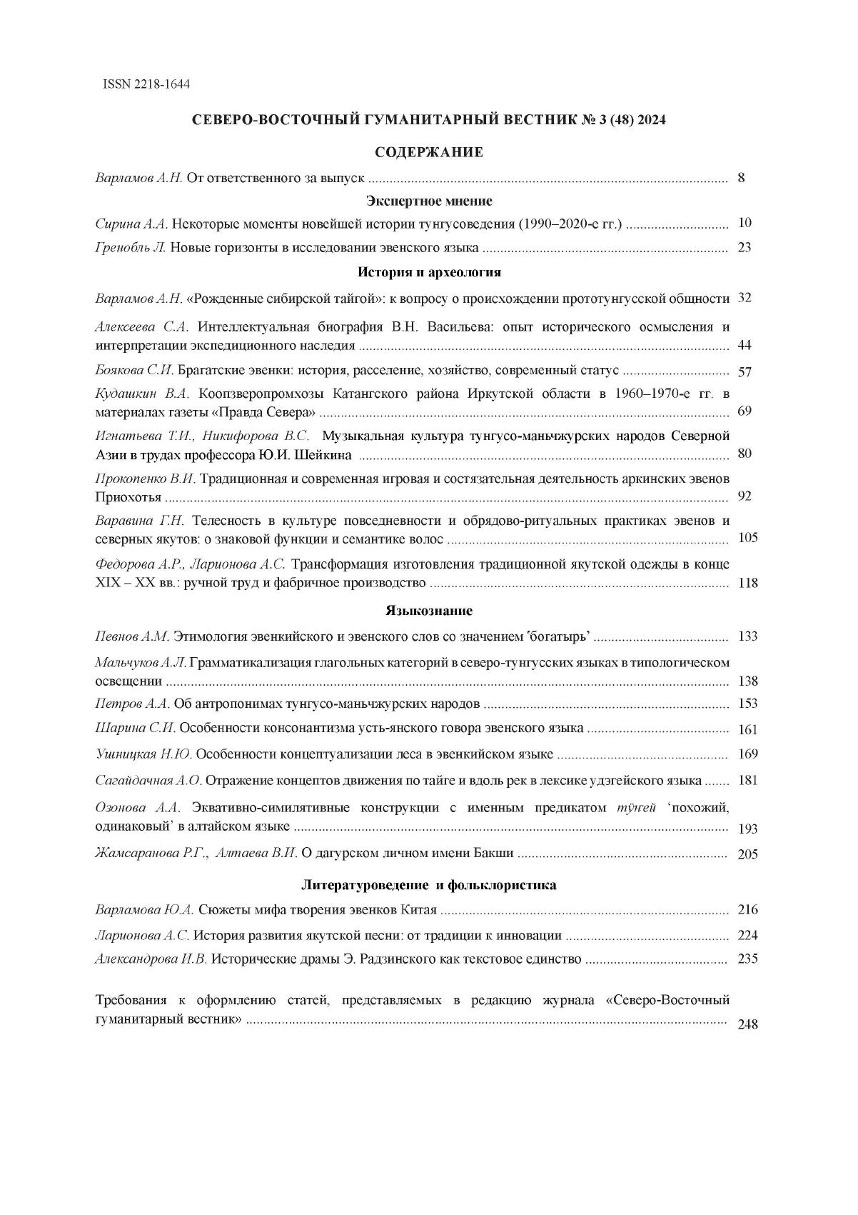 Северо-Восточный гуманитарный вестник : научный журнал / учредитель Инcтитут гуманитарных исследований и проблем малочисленных народов Севера СО РАН ; редколлегия: Ефремов Н. Н. (главный редактор) и др. - Якутск : Федеральное государственное бюджетное учреждение науки Институт гуманитарных исследований и проблем малочисленных народов Севера Сибирского отделения Российской академии наук, 2010-. - ISSN 2218-1644 (print). - 2024, N 3 (48). - 117 с.