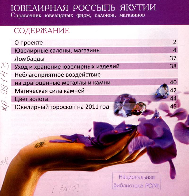 Ювелирная россыпь Якутии : справочник ювелирных фирм, салонов, магазинов / [автор проекта Галина Бочкарева ; руководитель проекта Дмитрий Громов]. - Якутск : Сахапечать, 2010. - 47 с.