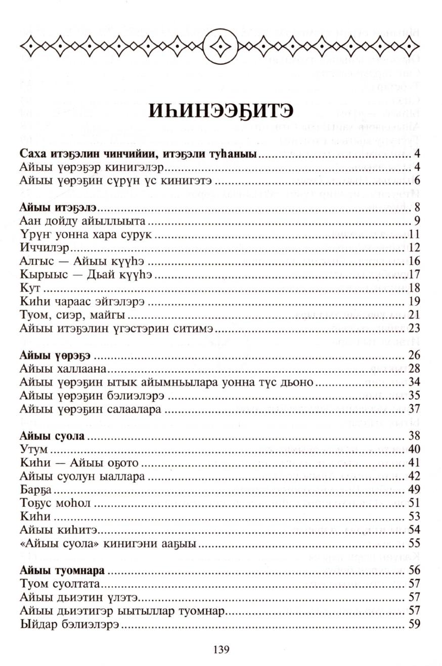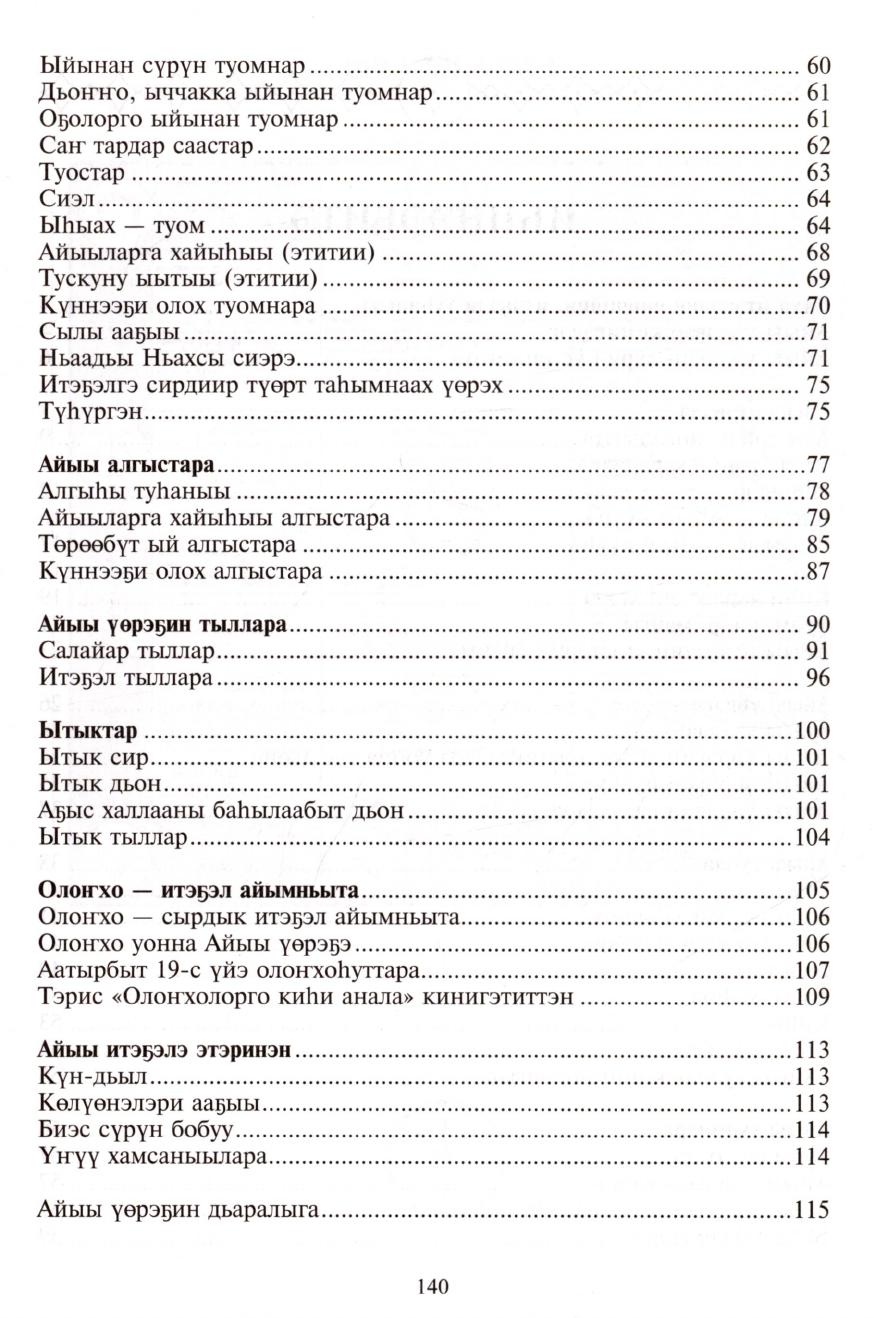 Айыы үөрэҕин төрүтэ : ыйынньык / [хомуйан оҥордо Ю. Г. Холмогорова ; консультант, сүрүннүүр ред. Л. А. Афанасьев-Тэрис ; ред. И. Е. Лукина-Уйусхаана ; символлар уруһуйдара, табылыысалар О. С. Горохов ; айыылар ойуулара А. Н. Гоголев-Сатал Уус]. - Дьокуускай : Сахаада, 2017. - 141 с.