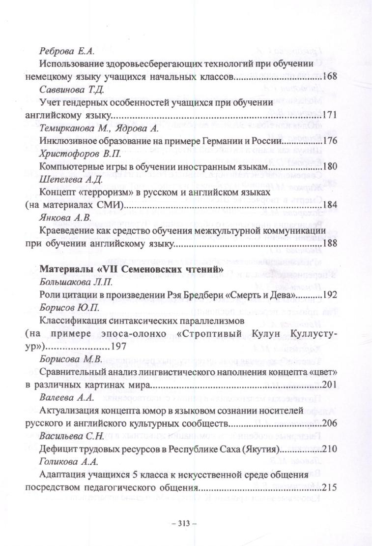 Материалы научной студенческой конференции "IV Семеновские стения", "V Семеновские чтения", "VI Семеновские чтения", "VII Семеновские чтения" (2008, 2009, 2010, 2011) : Институт зарубежной филологии и регионоведения СВФУ им. М. К. Аммосова / [редакционная коллегия: доктор филологических наук, профессор О. А. Мельничук, доктор педагогических наук Е. Д. Нелунова]. - Якутск : Издательский дом СВФУ, 2012. - 315 с.