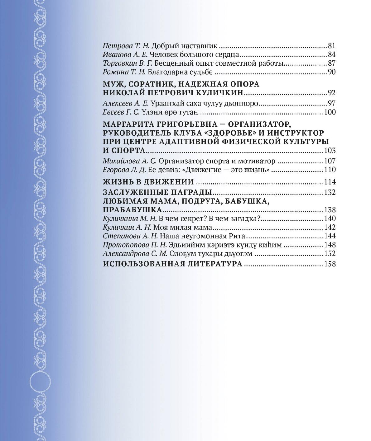 Книга-фотоальбом "Маргарита Куличкина. Жизнь в движении" содержит биографические сведения о жизни и деятельности Маргариты Григорьевны Куличкиной, заслуженного работника физической культуры ЯАССР, почетного работника физической культуры РС(Я), отличника физической культуры и спорта СССР и РСФСР, мастера спорта по лыжным гонкам Якутской АССР, "Учителя учителей РС(Я)", почетного гражданина г. Вилюйска и Вилюйского улуса, ветерана спорта РСФСР и РС(Я), а также воспоминания учеников, коллег и родных. Издание приурочено к 85-летию героини книги. Предназначено для широкого круга читателей