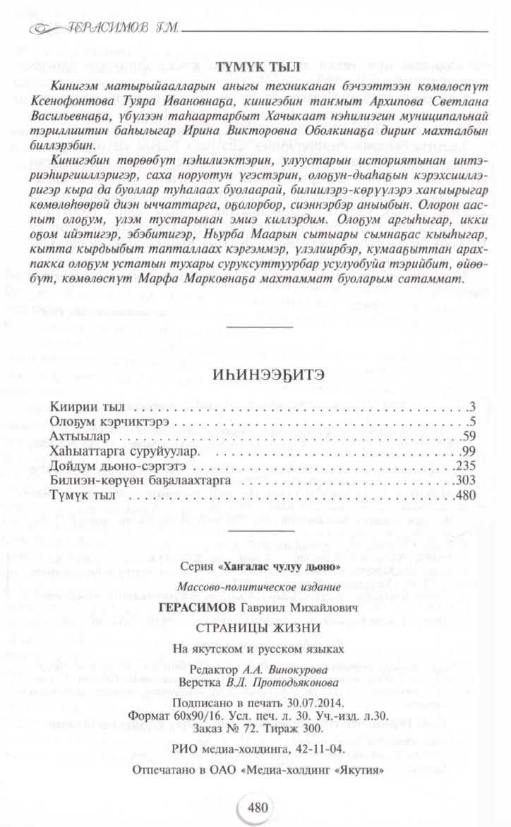 Олоҕум кэрчиктэрэ : ахтыылар, ыстатыйалар, пьеса / Г. М. Герасимов ; [редакционная коллегия: А. Е. Егоров, Л. Д. Аммосов, С. В. Архипова] ; "Хаҥалас улууһа", "Хачыкаат нэһилиэгэ" муниципальнай тэриллиилэр дьаһалталара "Хаҥалас" общественнай тэрилтэ. - Дьокуускай : РИО Медиа-Холдинга, 2014. - 480 с. : ил., портр. ).