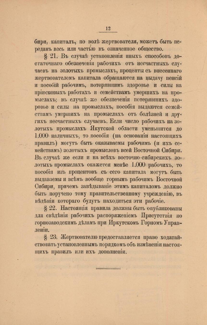 Положение о капитале имени потомственного почетного гражданина Михаила Александровича Сибирякова для выдачи пособий приисковым рабочим Якутской области. - Санкт-Петербург : Типография И. Н. Скороходова [(Надеждинская, 43)], 1895. - 12 с.