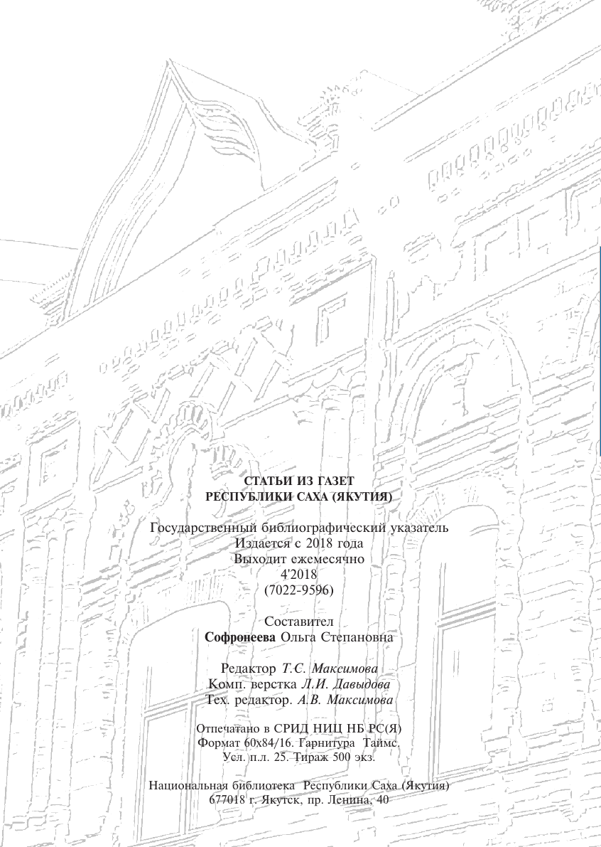 Статьи из газет Республики Саха (Якутия) : государственный библиографический указатель = Саха Өрөспүүбүлүкэтин хаһыаттарыгар киирбит ыстатыйалар : судаарыстыбаннай библиографическай ыйынньык / Министерство культуры и духовного развития Республики Саха (Якутия), Национальная библиотека Республики Саха (Якутия), Центр обеспечения информационными ресурсами. - Электрон. дан. - Якутск : ИЦ НБ РС(Я), 2018- 2018, N 4 (7022-9596). - Электрон. дан. (1 файл: 9,35 Мб). - 2018. - 399, [1] с.