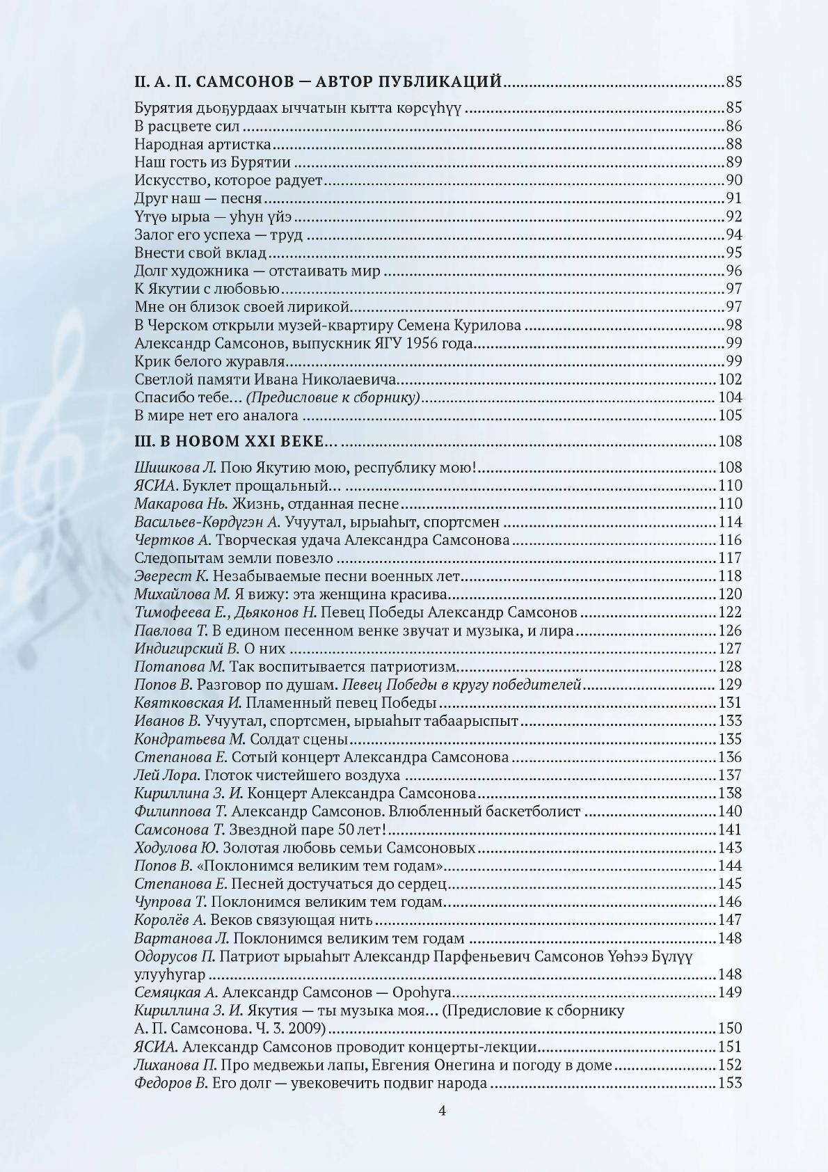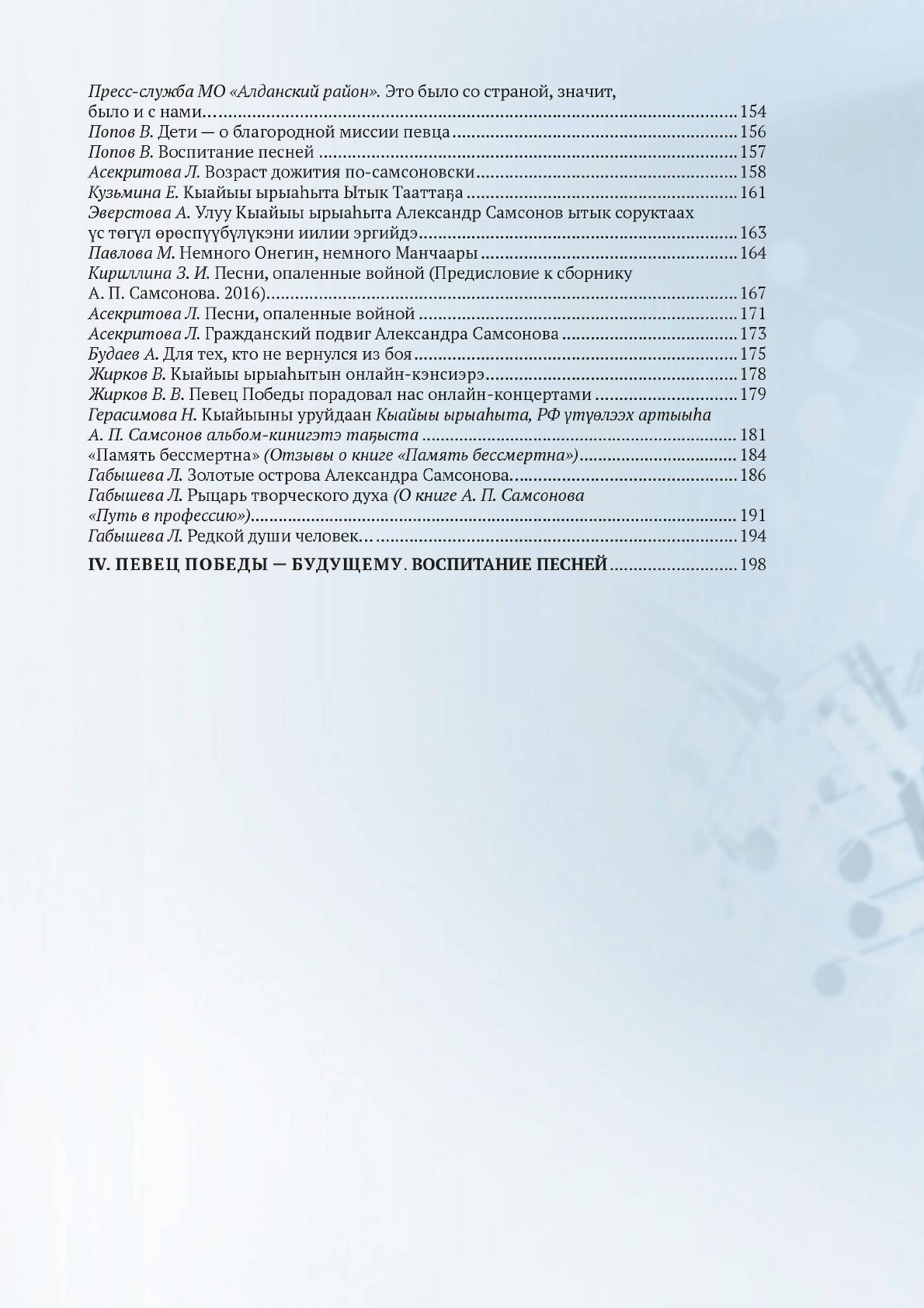 Певец Победы Александр Самсонов : к 90-летию заслуженного артиста РФ, народного артиста РС(Я) : сборник статей / Министерство культуры и духовного развития Республики Саха (Якутия), Национальная библиотека Республики Саха (Якутия) ; составитель Л. Л. Габышева ; [авторы предисловий: А. С. Николаев, В. О. Иванов, С. В. Максимова, Л. Л. Габышева]. - Якутск : ИЦ НБ РС (Я), 2025. - 1 файл (262 с.)