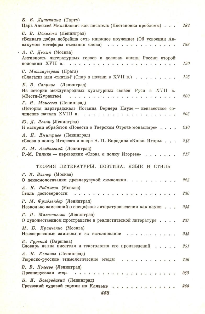 Сборник состоит из статей, а которых рассматриваются проблемы истории древнерусской литературы и культуры, поэтика и стилистика средневековой литературы и литературы нового времени, вопросы текстологии и библиографии. В нем исследуются отдельные произведения, прослеживаются связи древнерусской литературы с другими славянскими литературами средневековья, выявляются жанровые и языковые особенности русской литературы XI—XVII вв. Ряд работ посвящен анализу литературных явлений XVIII—XX вв. в их связях с литературой и культурой Древней Руси