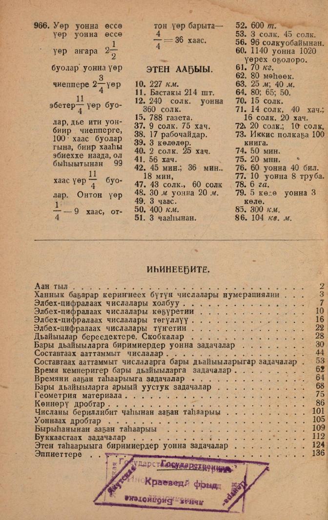 Арифметика задачаларын уонна эрчиллиилэрин хомуура : бастааҥҥы школа төрдүс классыгар : [4 чаастаах] / Н. С. Попова, А. С. Пчелко ; Г. С. Тарскай тылбааһа. - Москва : РСФСР ҮНК государственнай үөрэх-педагогическэй издательствэтэ, 1939. - 20 см. Ч. 4. - 1939. - 140 с.