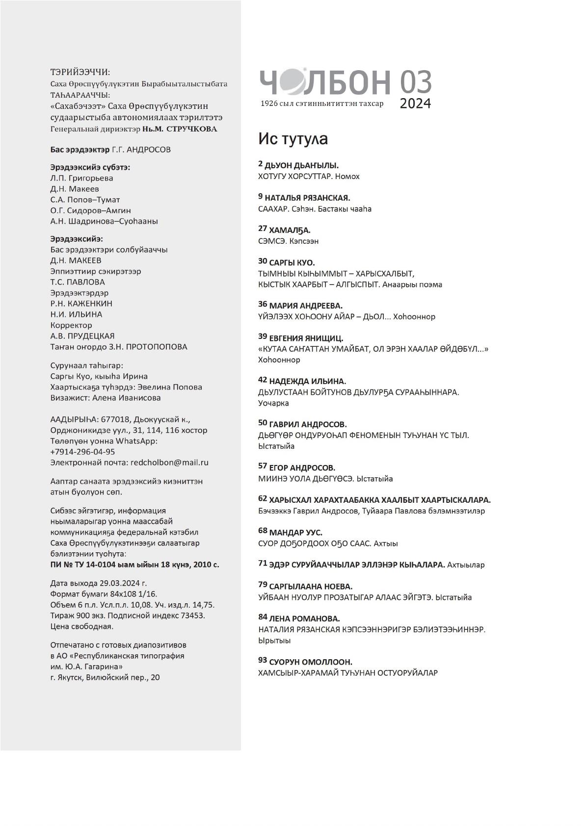 Чолбон : [уус-уран литературнай уонна общественнай-политическай сурунаал] / Саха Өрөспүүбүлүкэтин Бырабыыталыстыбата. - Дьокуускай, 1999