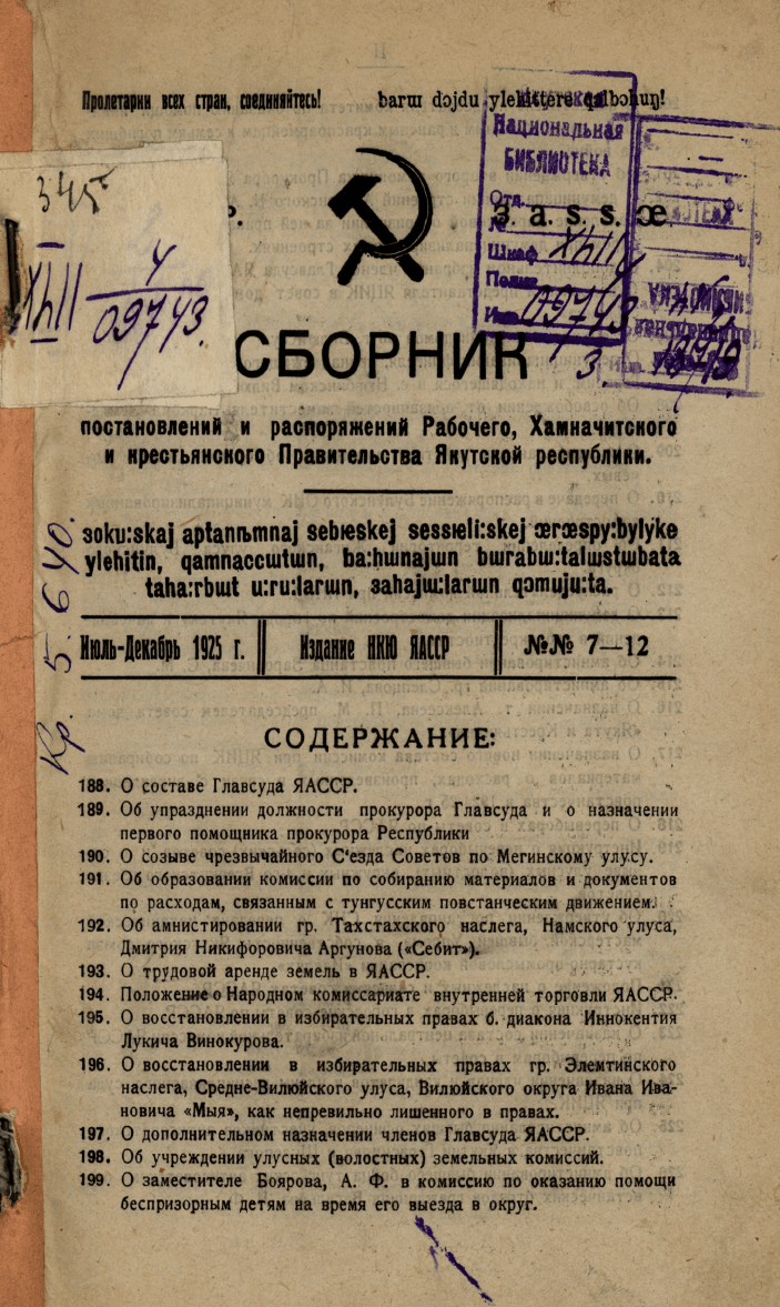 Сборник постановлений и распоряжений Рабочего, Хамначитского и крестьянского Правительства Якутской Республики