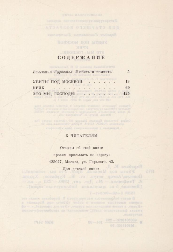 Убиты под Москвой ; Крик ; Это мы, господи! : повести : [для старшего возраста] / Константин Воробьев ; [вступительная статья В. Курбатова ; художник А. Тамбовкин]. - Москва : Детская литература, 1990. - 221, [2] с.