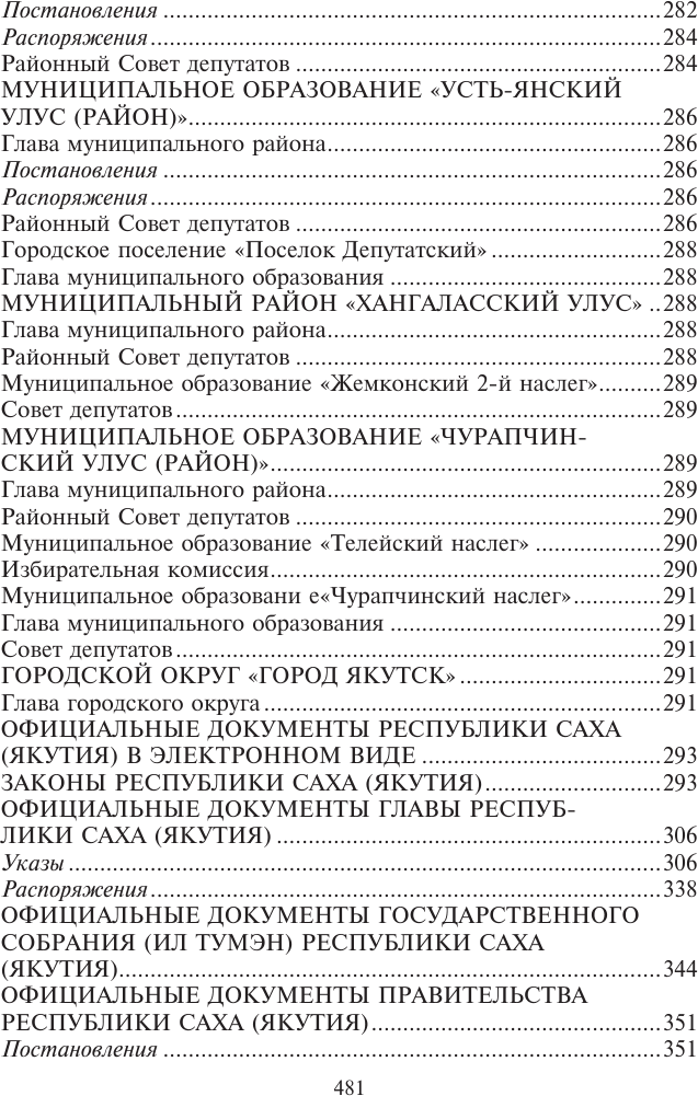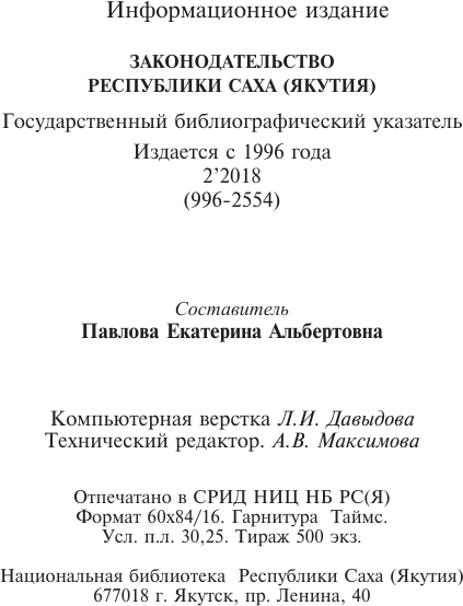 Законодательство Республики Саха (Якутия) : государственный библиографический указатель = Саха Өрөспүүбүлүкэтин Сокуонтаһаарыы : судаарыстыбаннай библиографическай ыйынньык / Министерство культуры и духовного развития Республики Саха (Якутия), Национальная библиотека Республики Саха (Якутия), Национальное библиографическое агентство. - Электрон. дан. - Якутск : СРИД НБ РС(Я), 2018-. 2018, N 2 (996-2554). - Электрон. дан. (1 файл: 8,35 Мб). - 2018. Режим доступа:http://e.nlrs.ru/open/13650. - Имен., геогр., предм. указ.: с. 448-474.