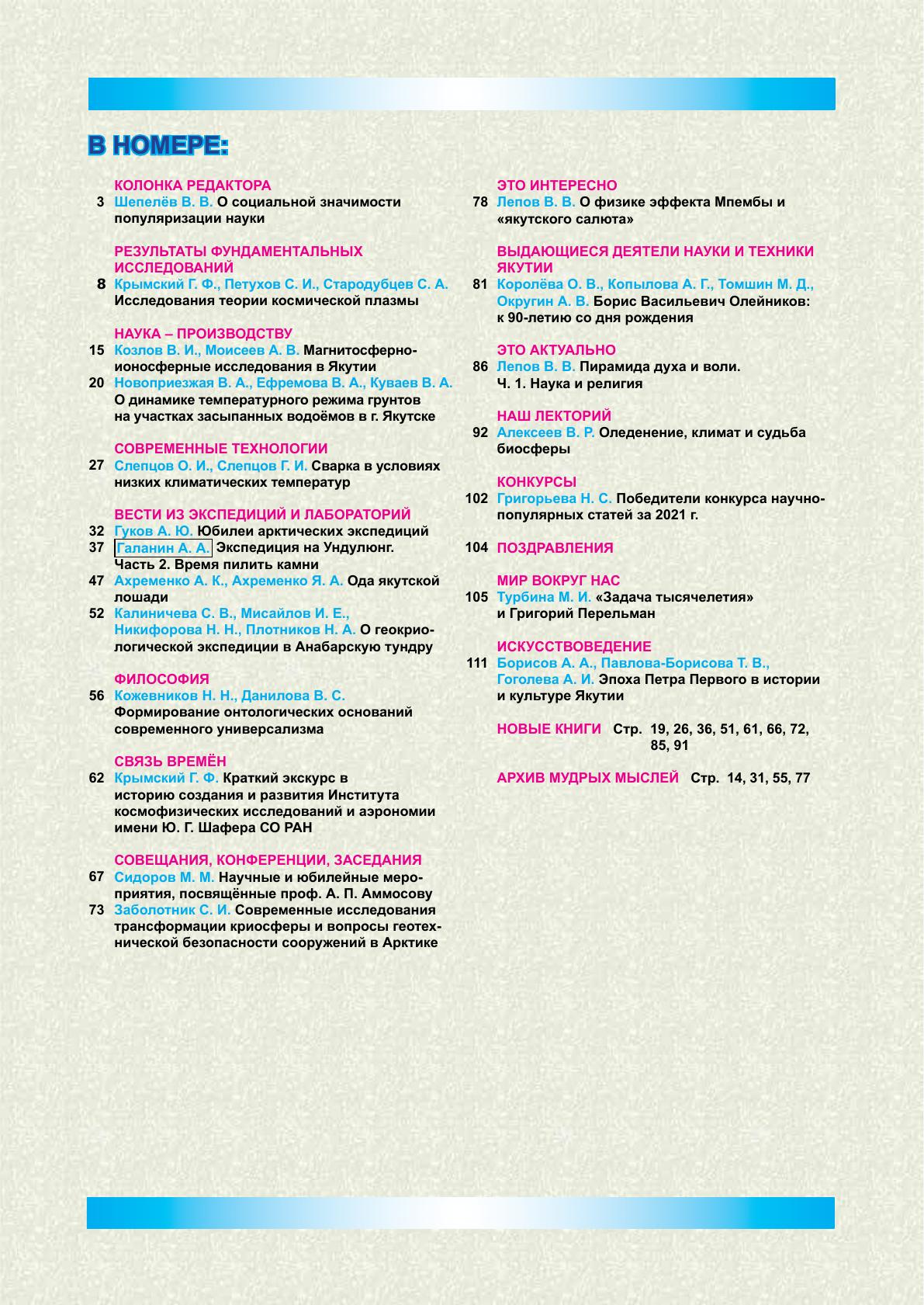 Наука и техника в Якутии : научно-популярный журнал / учредители: Министерство науки и профессионального образования РС (Я), Якутский научный центр СО РАН, Академия наук РС(Я), Якутский государственный университет им. М. К. Аммосова. - Якутск : Издательство СО РАН, Якутский филиал, 2022, N 1 (42). - 116 с.
