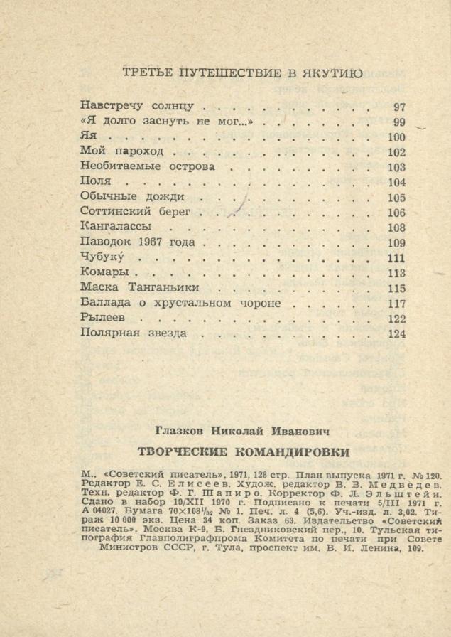 Московского поэта Николая Глазкова любители поэзии знают по его стихотворным сборникам "Моя эстрада", "Зеленый простор", "Поэтоград", "Дороги и звезды","Пятая книга", "Большая Москва" и стихам, публиковавшимся в периодической печати. Поэт Глазков много ездит по стране — и каждое путешествие вдохновляет его на новые стихотворения. Ознакомившись с книгой "Творческие командировки", любители поэзии почувствуют себя и любителями географии. Если читателям книги суждено будет посетить родной город поэта Лысково или Беловежскую пущу, Южный Урал или озеро Иссык-Куль, Красноярский край или далекую Якутию, они вспомнят поэта-путешественника Николая Глазкова