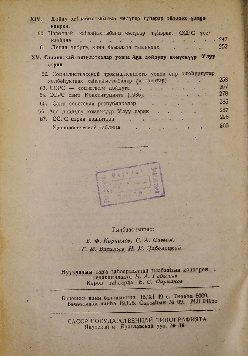 ССРС историята : кылгас курс : 4-с кылаас учебнига / проф. А. В. Шестаков ред. ; [нууччалыы саҥа таһаарыыттан тылб. көннөрөн ред. Н. А. Габышев ; тылб. Е. Ф. Корнилов уо. д. а.]. - Якутскай : Саха АССР Госиздата, 1949. - 305, [1] с.