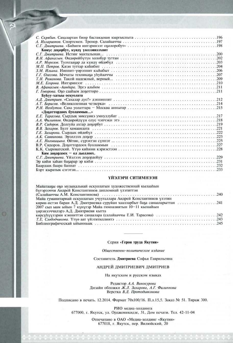 Андрей Дмитриевич Дмитриев : Үлэ Албан Аат уордьан толору кавалера, Мэҥэ-Хаҥалас оройуонун бочуоттаах гражданина / [хомуйан оҥордулар: С. Г. Дмитриева, М. И. Харитонова ; эппиэттиир ред. Ф. Н. Охлопкова]. - Дьокуускай : Медиа-холдинг Якутия, 2015. - 245, [3] с., [8] л. цв. ил., портр.