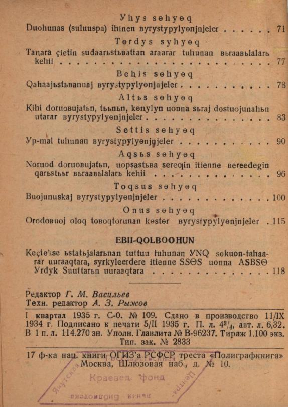 АСБСӨ холуобунай кедьиексэтэ : 1934 с. ахсынньы ый 1 к. дылы тахсыбыт уларыйыылардыын / [ред. Г. М. Васильев]. - Москуба : Судаарыстыба сэбиескэй сокуону-таһаарар кинигэ бэчээттиир суута, 1935. - 151, [1] с.
