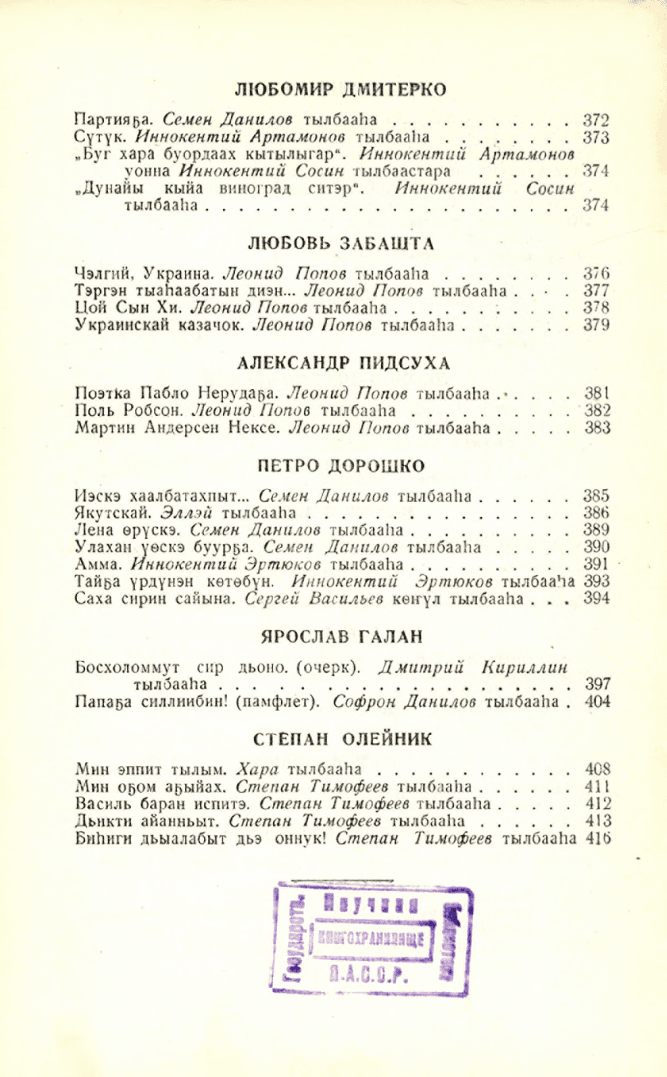 Украина суруйааччылара / [хомуйан оҥордулар С. П. Данилов, М. Д. Ефимов, И. Е. Федосеев ; аан тылы суруйдулар В. Протодьяконов, Амма Аччыгыйа]. - Якутскай : Саха сиринээҕи кинигэ изд-вата, 1954. - 421 с.