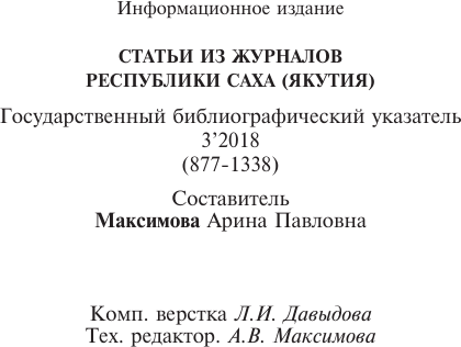 - 1. Статьи из журналов Республики Саха (Якутия) = Саха Өрөспүүбүлүкэтин сурунаалларыгар киирбит ыстатыйалар: государственный библиографический указатель. судаарыстыбаннай библиографическай ыйынньык