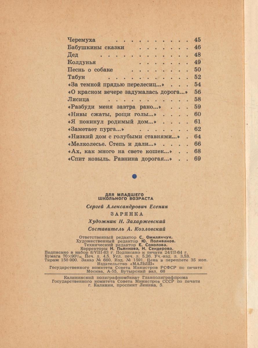 Зарянка : сборник стихотворений : [для младшего школьного возраста] / Сергей Есенин ; [художник Н. Захаржевский ; составитель А. Козловский]. - Москва : Малыш, 1964. - 72 с.