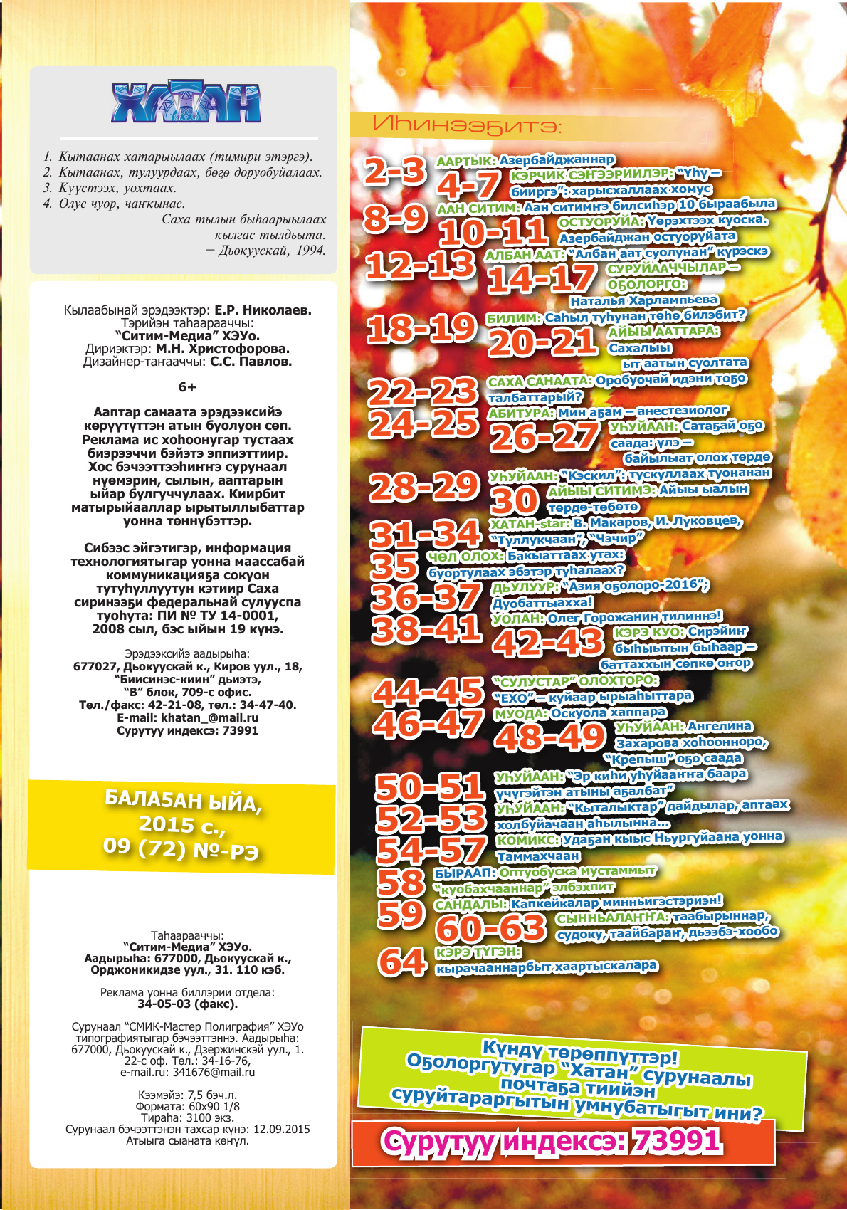 2015, N 9 (72), балаҕан ыйа. - 2015. - 64 с.