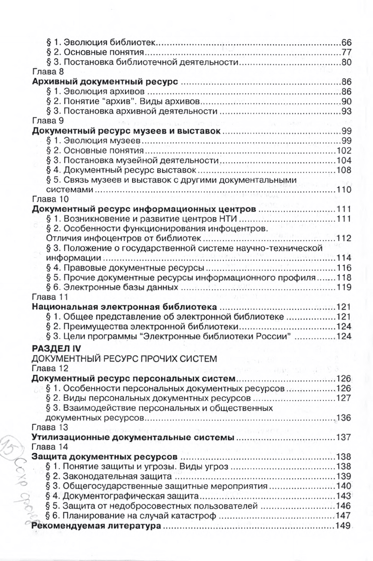 Данное целостное представление о документных массивах, документных фондах и документных потоках, составляющий национальный документный ресурс России. Особенно обстоятельно охарактеризованы ресурсы самых крупных специализированных документных систем - библиотек, музеев, органов информации.