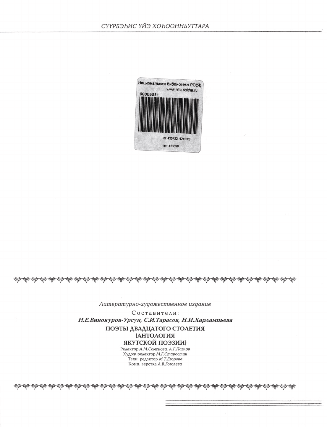 Сүүрбэһис үйэ хоһоонньуттара : саха поэзиятын антологията / [хомуйан оҥордулар: Н. Е. Винокуров - Урсун, С. И. Тарасов, Н. И. Харлампьева]. - Дьокуускай : Бичик, 2000. - 336 с.