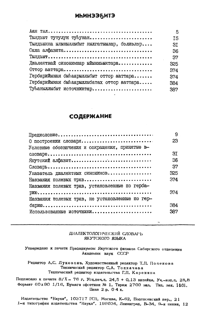 Диалектологический словарь якутского языка = Саха тылын диалектологическай тылдьыта : содержит свыше 8500 слов / сост.: П. С. Афанасьев, М. С. Воронкин, М. П. Алексеев ; [отв. ред.: П. С. Афанасьев, В. М. Наделяев ; Акад. наук СССР, Якут. фил. Сиб. отд-ния, Ин-т яз., лит. и истории]. - Москва : Наука, 1976. - 391, [1] с., [1] л. к.