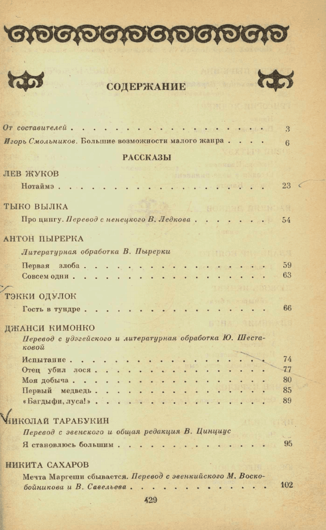 В сборник вошли произведения писателей Крайнего Севера и Дальнего Востока. Наряду с избранными рассказами Г. Ходжера, Ю. Рытхэу, Ю. Шесталова, В. Санги, В. Коянто, Н. Селивановой представлена проза зачинателей литературы этого региона - юкагира Тэкки Одулока, ненца Тыко Вылки, удэгейца Джанси Кимонко. Всех участников сборника объединяет стремление правдиво отобразить жизнь своего народа, его прошлое и настоящее