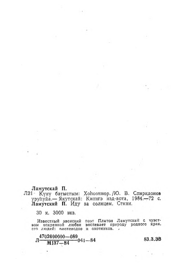 Известный эвенский поэт Платон Ламутский с чувством искренной любви воспевает природу родного края, его людей: оленеводов и охотников