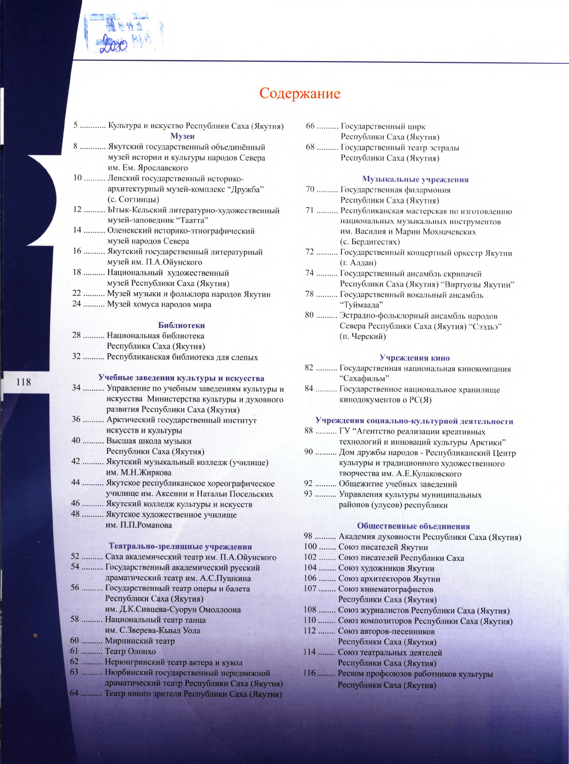 Справочно-информационное издание содержит сведения об учреждениях культуры и искусства Республики Саха (Якутия). Его выход приурочен к проведению республиканского форума "Духовный потенциал общества в инновационном развитии Якутии"