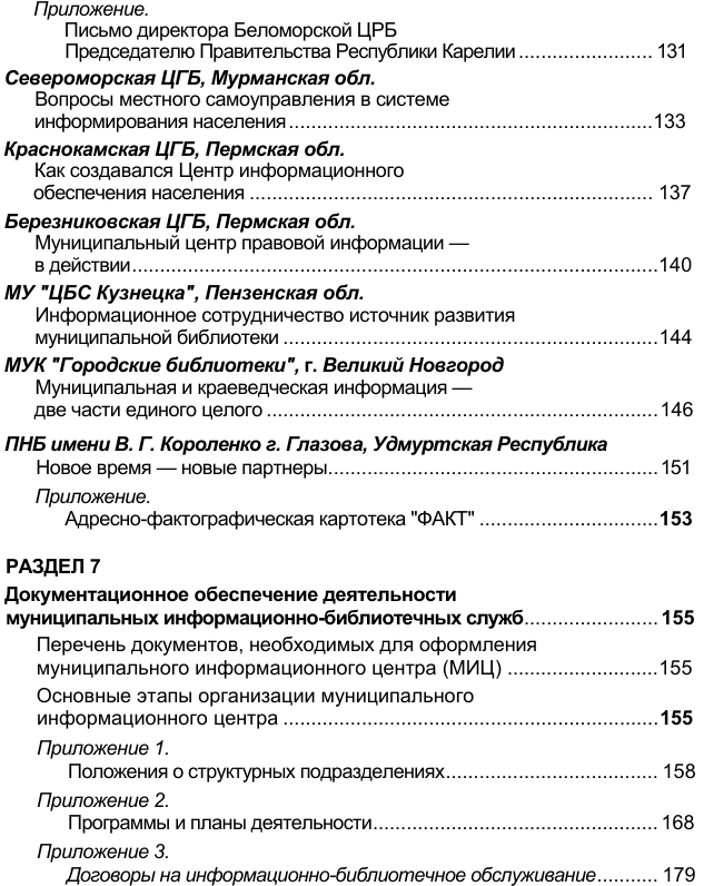 Основу сборника составили аналитические материалы, подготовленные в ходе исследования "Создание действующей модели информационного обслуживания различных групп населения средствами муниципальных библиотек и оказание методической помощи органам местной власти и библиотекам в создании муниципальных информационных центров" (2000-2001 гг.) в рамках федеральной целевой программы Министерства по делам Федерации, национальной и миграционной политики РФ и Министерства культуры РФ. В книгу вошли также описания деятельности библиотек, представляющей общественный интерес, и библиотечные документы, которые могут быть использованы при разработке документационного обеспечения эффективной работы муниципальной библиотеки